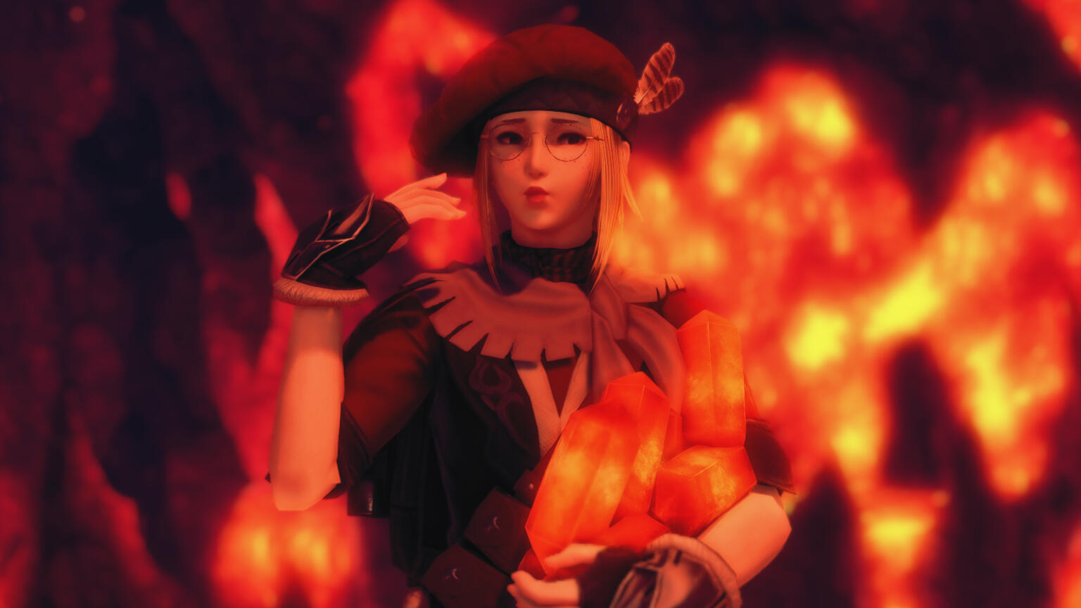 If an outfit isn’t red, she will dye it, paint it, or sew red onto it until it submits. Crimson, scarlet, wine, rust—she doesn’t discriminate. The result is an unmistakable silhouette: a blaze of red darting across gangways with a pizza box tucked under her arm, or a crimson jacket thrown over leathers as she leans on a railing between deliveries. Even on her rare days off, she can’t resist incorporating a splash of red somewhere—a sash, a bandana, a ribbon tied around her wrist like a promise.Altogether, Marisa looks exactly like what she is: a young woman straddling two worlds, determined to blaze her own route through them—freckled, fierce, bright-eyed, and leaving a streak of red and the faint smell of melted cheese in her wake as she darts through the white marble and blue seas of Limsa Lominsa.