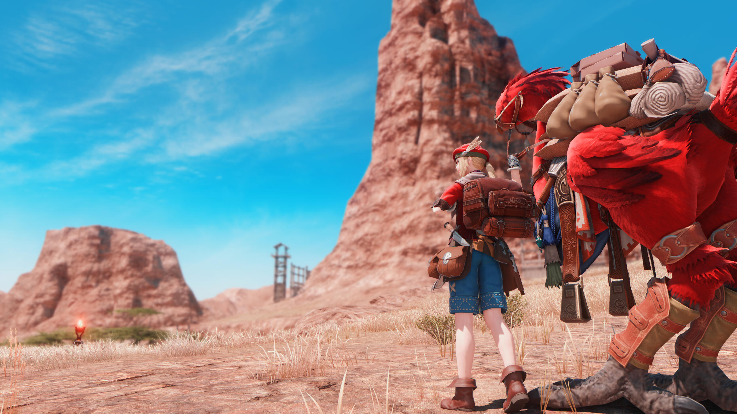 Meeting her gladiator friend Sylfreyr Star-strider outside of The Quicksand in Ul'dah, Marisa entreats his assistance for a pizza delivery to Black Brush Station. What should have been a quick and easy job became complicated when they are instead approached by a Hellsguard named Broken Arrow, who informed that the customers she were to meet had rather inconveniently made for Camp Drybone in the far east to excavate a Belah'dian ruin said to be filled with treasure. Understandably vexed, Marisa was nonetheless enticed to continue the delivery after being promised a share of the loot as compensation.Leaving Black Brush behind, their journey eastward is unexpectedly interrupted when an antling (likely drawn by the scent of pizza) attempted to ram them off the road—but it was out of the fire and into the pond when Marisa drives right into the middle of a gigantoad spawning ground, with one of the beastkin catching her bike with its tongue. Before it could make could swallow them whole, Sylf is able to scare it away with a few taps of his sword, allowing them to continue onwards to Camp Drybone...